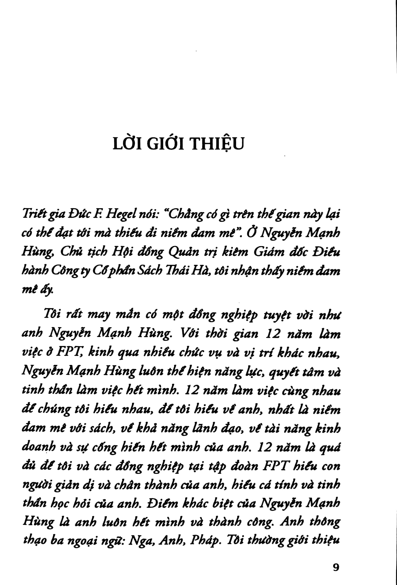Nguyễn Mạnh Hùng chuyển từ FPT sang lĩnh vực mới – xuất bản sách. Tôi đã theo dõi và cổ vũ cho sự thành công của anh ấy với Thái Hà Books. Tôi rất vui được viết lời giới thiệu cho cuốn sách đầu tiên của bạn. Cuốn sách này là tập hợp một số bài báo của ông đã đăng trên các báo và tạp chí lớn của Việt Nam trong vài năm qua. Nội dung của cuốn sách này đến từ những bài học sâu rộng ngoài kiến ​​thức và chia sẻ kiến ​​thức. Tại đây, độc giả cũng có thể xem những bức ký họa chân dung của Nguyễn Mạnh Hùng – những nét tính cách, những cột mốc cuộc đời, những trăn trở, lo lắng của người doanh nhân khi đối mặt với các vấn đề xã hội. Như phụ đề của cuốn sách nói: Doanh nhân với Tinh thần xã hội, tôi rất vui khi thấy điều đó ở Mr.